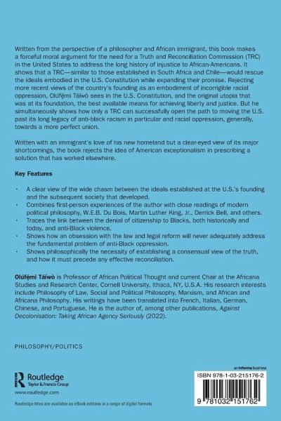 Written from the perspective of a philosopher and African immigrant, this book makes a forceful moral argument for the need for a Truth and Reconciliation Commission (TRC) in the United States to address the long history of injustice to African-Americans. It shows that a TRC-similar to those established in South Africa and Chile-would rescue the ideals embodied in the U.S. Constitution while expanding their promise. Rejecting more recent views of the country's founding as an embodiment of incorrigible racial oppression, Olúf mi Táíwò sees in the U.S. Constitution, and the original utopia that was at its foundation, the best available means for achieving liberty and justice. But he simultaneously shows how only a TRC can successfully open the path to moving the U.S. past its long legacy of anti-black racism in particular and racial oppression, generally, towards a more perfect union.