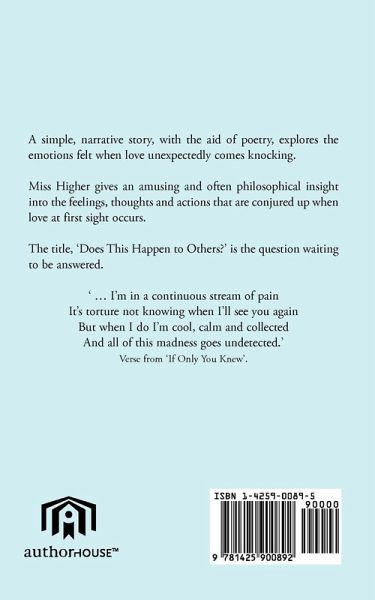 A simple, narrative story, with the aid of poetry, explores the emotions felt when love unexpectedly comes knocking. Miss Higher gives an amusing and often philosophical insight into the feelings, thoughts and actions that are conjured up when love at first sight occurs. The title, 'Does This Happen to Others?' is the question waiting to be answered. ' . I'm in a continuous stream of pain It's torture not knowing when I'll see you again But when I do I'm cool, calm and collected And all of this madness goes undetected.' Verse from 'If Only You Knew'.