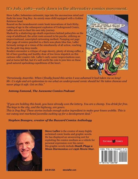 It's 1982-early dawn in the alternative comics movement. Steve Lafler, bohemian cartoonist, taps into his unconscious mind and finds his inner Dog Boy: An unruly man-child equipped with a Golden Retriever head. Reared on the incandescent comic book innovations of Jack Kirby, coming of age in the subsequent explosion of Underground Comix, Lafler sets out to chart his own inky journey. Marked by a shattering ego-death experience behind psilocybin on the cusp of adulthood, the artist roots around in his psyche, utilizing an improvisational, unscripted cartooning method. Pumping out page after page of comics penciled in a thick non-photo blue line, he furiously swings at a vision of the simultaneity of all action, reaching for the gold ring deep inside. Readers encounter a critique of wage slavery, plenty of strong coffee, a bit of beer guzzling and healthy dose of low-brow slapstick on this cartoon roller coaster ride. Lafler's early career improvisations soar, and at turns fall flat, but it's well worth the coin to join him on these good natured spelunking expeditions of the heart.