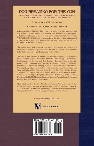 Originally published in 1848, this book was so well received by sportsmen and dog owners alike, that several more editions were published in ensuing years. All of these early editions are now very scarce and increasingly hard to find. VINTAGE DOG BOOKS has now republished the fifth, revised and enlarged edition of 1869, using the original text and engravings, as part of their CLASSIC BREED BOOK series. The author was a well respected dog breeder and trainer with a lifetime's experience of working dogs in the field. His book is still considered by many to be the finest work on gundog training ever written. The book's substantial three hundred and seventy two pages contain twenty three comprehensive, illustrated chapters: - Preliminary Observations. Qualifications, in Breaker and Dog. - Initiatory Lessons Indoors. Shooting Ponies. - Initiatory Lessons with Spaniels. - Retrievers. - Lessons Out of Doors. - First Lesson in September. Ranging. - Caution. Nature's Mysterious Influences. - Cunning of Age. Range of from Two to Six Dogs. - Pointing. - Vermin. -Bar, Leg Strap and Spike Collar. - Shooting Hares. - Hints to Purchasers. - Sheep Killing. - Anecdotes on Dogs on Service at Home. - Service Abroad. - Russian Setters. - Whistles, "Backing", Ranging, Runners. - Retrieving with Setters. - Bloodhounds. - Health. - Shooting. - Loading. - Trapping. - Vermin Control. - Pheasant Rearing. - Poachers. - Keepers. - Night Dogs etc. The book also contains many steel and wood engravings of dogs and sporting scenes. This is essential reading for anyone requiring information on dog training, whether it be for the field or home. "Be to his virtues ever kind Be to his faults a little blind." Many of the earliest dog breed books, particularly those dating back to the 1900s and before, are now extremely scarce and increasingly expensive. VINTAGE DOG BOOKS are republishing these classic works in affordable, high quality, modern editions, using the original text and artwork.
