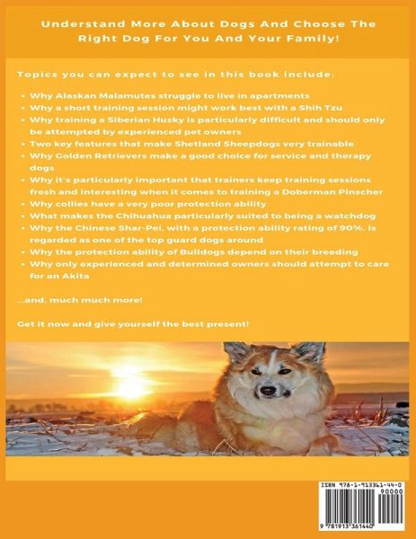 It's easy to fall in love with a dog breed and rush into buying a gorgeous Border Collie or an intimidating Doberman Pinscher, but this is a mistake! Buying a dog should be a long, careful process - a new dog is, after all, a new family member and Every dog deserves more than a loving home - they deserve the right loving home! There are a number of things that potential dog owners need to consider before making the leap: Does the dog breed you've fallen in love with fit in with your lifestyle? If you work eight hours a day, can the dog be left on its own in your home, or will it become stressed and destructive? If you have other pets, will the dog get along with them? Is the dog child-friendly, or will it quickly lose patience? It works both ways; a new dog must fit in with their owner's lifestyle, but new owners also need to have the skills and patience necessary to provide adequate care for their new canine companion. Prospective dog owners should ask themselves, Do I have the time to give this breed all the exercise it needs? Do I have the energy to keep up with them? Am I willing to buy it a doggie jacket when the weather gets chilly? Do I want a mellow lap dog or an excitable adventuring buddy? This book will analyze 50 dog breeds in terms of their protection ability, trainability, playfulness, exercise needs and adaptability. If you're a prospective dog owner or even just an enthusiast, you'll find this book helpful! In this book, you'll discover: Why Alaskan Malamutes struggle to live in apartments A distinct characteristic of Shiba Inu that makes it unsuitable as a watchdog Why a short training session might work best with a Shih Tzu Why training a Siberian Husky is particularly difficult and should only be attempted by experienced pet owners Two key features that make Shetland Sheepdogs very trainable Why Golden Retrievers make a good choice for service and therapy dogs Why it's particularly important that trainers keep training sessions fresh and interesting when it comes to training a Doberman Pinscher Why Queen Victoria fell in love with her collie during a visit to her Scottish estate back in 1860 and why collies have a very poor protection ability What makes the Chihuahua particularly suited to being a watchdog Why the Chinese Shar-Pei, with a protection ability rating of 90%, is regarded as one of the top guard dogs around Why the protection ability of Bulldogs depend on their breeding Why only experienced and determined owners should attempt to care for an Akita ...And much much more! Getting that perfect companion for you and your family shouldn't be a hassle. We've simplified the process for you. If you're ready to discover the perfect dog breed that will not only compliment your lifestyle but also integrate well with your environment and family, get your copy of this book today. Scroll to the top of the page and click the "BUY NOW" button!