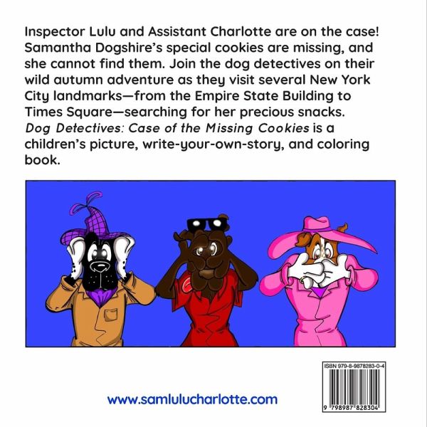 Inspector Lulu and Assistant Charlotte are on the case! Samantha Dogshire's special cookies are missing, and she cannot find them. Join the dog detectives on their wild autumn adventure as they visit several New York City landmarks-from the Empire State Building to Times Square-searching for her precious snacks. Dog Detectives: Case of the Missing Cookies is a children's picture and coloring book.