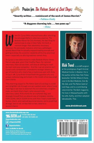 When Dr. Cyrus Mills returned home after inheriting his estranged father's veterinary practice, The Bedside Manor for Sick Animals, the last thing he wanted was to stay in Eden Falls, Vermont, a moment longer than absolutely necessary. However, the previously reclusive veterinarian pathologist quickly found that he actually enjoyed treating animals and getting to know the eccentric residents of the tiny provincial town-especially an alluring waitress named Amy. So Cyrus is now determined to make Bedside Manor thrive. Not an easy goal, given that Healthy Paws, the national veterinary chain across town, will stop at nothing to crush its mom-and-pop competitor. And the rival vet practice isn't Cyrus's only competition; a handsome stranger shows up out of nowhere who clearly has a mysterious past with Amy. To top it off, Cyrus finds himself both the guardian of a very unique orphaned dog and smack in the middle of serious small town drama. This charming sequel to The Patron Saint of Lost Dogs is a wild and delightful ride through one jam- packed week, where Cyrus must figure out how to outsmart the evil veterinary conglomerate, win back Amy's heart, solve several tricky veterinary cases, find a home for an orphaned dog, and detangle himself from an absurd case of mistaken identity. DOG GONE, BACK SOON brims with Nick Trout's trademark humor, charm, and captivating animal stories, and is proof that all dogs, lost or not, on four feet or two, deserve a second chance.