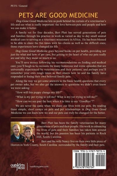 Dog-Gone Good Medicine gives the reader a look behind the curtain of a small town's veterinarian's practice life and see what is really important: the love shared between pets and people and how we can make it better. A family vet for four decades, Bert Platt has served generations of pets and families through his small animal practice, becoming an extended part of their lives. His experiences with pets has extended to almost every aspect of veterinary practice: from day to day small animal medical care to working with government agencies on pet care issues to serving as a livestock veterinary missionary in Africa. He has been blessed to be able to experience the exciting and fun times as well as the difficult ones, and those experiences have changed his life. By sharing them in this book, Bert allows the readers to be changed as well, helping them understand how they can make their own pet relationships more meaningful. Dog Gone Good Medicine goes beyond the many books on pet health care, providing not just the what and how of pet care, but getting to the heart of who pets really are and why they mean so much to their families. Through many specific patient experiences, Bert helps explain the best ways to keep pets healthy, and also the best ways to keep pet relationships healthy. The reader will save money by following his recommendations on feeding and medical care, laugh as he recounts the many humorous and ironic episodes that are universally experienced by veterinarians and their patients, and perhaps remember their own tough times as Bert shares how he and his family have responded to losing their own beloved family pet. Along the way we get some answers to the basic questions that every pet owner asks: What kind/breed/size pet is best for me? What food/treats/toys/medicines are best for my pet? What the most important things I can do to keep my pet healthy and happy? But we also get the answers to questions we didn't even know we were asking: How will
