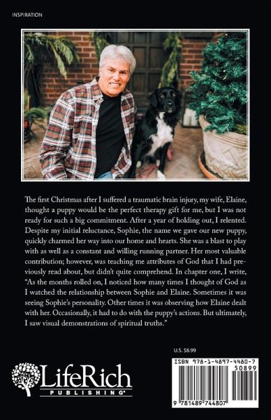 My wife, Elaine, originally thought a puppy would be good therapy for me in the midst of my ongoing recovery from the traumatic brain injury I suffered several months earlier. But the reality was that she wanted to add a new member to our household, but didn't recognize it the time she initiated the idea of getting a puppy. Her saying it was for my benefit ended up being somewhat of a smokescreen. After clearing up the rationale for getting a puppy, I discovered several personal benefits once we got Sophie (our dog's name), including getting to own such a cool and precious dog as well as having a ready and willing runner partner anytime I went for a run. But the most important and biggest value has been what Sophie has shown me about God. In chapter one, I write, "As the months rolled on, I noticed how many times I thought of God as I watched the relationship between Sophie and Elaine. Sometimes it was seeing Sophie's personality. Other times it was observing how Elaine dealt with her. Occasionally, it had to do with the puppy's actions. But ultimately, I saw visual demonstrations of spiritual truths."
