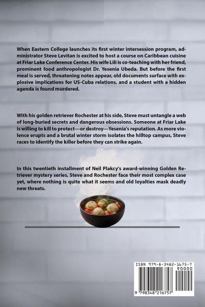 When Eastern College launches its first winter intersession program, administrator Steve Levitan is excited to host a course on Caribbean cuisine at Friar Lake Conference Center. His wife Lili is co-teaching with her friend, prominent food anthropologist Dr. Yesenia Ubeda. But before the first meal is served, threatening notes appear, old documents surface with explosive implications for US-Cuba relations, and a student with a hidden agenda is found murdered. With his golden retriever Rochester at his side, Steve must untangle a web of long-buried secrets and dangerous obsessions. Someone at Friar Lake is willing to kill to protect-or destroy-Yesenia's reputation. As more violence erupts and a brutal winter storm isolates the hilltop campus, Steve races to identify the killer before they can strike again. In this twentieth installment of Neil Plakcy's award-winning Golden Retriever mystery series, Steve and Rochester face their most complex case yet, where nothing is quite what it seems and old loyalties mask deadly new threats.