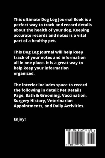 This unique Dog Log notebook, tracker is a handy way that dog owners can keep record of their dog's health and wellness. Your dog's wellbeing is essential for a happy, healthy dog. After all, dogs are not just our pets, they're our family! The interior includes space and prompts to record the following: Pet Details Page - Write Pet Name, Date of Birth, Owner's Name, Address, Phone Number, Vet's Name & Contact, Allergies & Conditions. Bath & Grooming - Track when they get a bath & groomed, date, time, age, weight & procedure. Vaccination - Record Vaccinations and Immunization, Date & Age. Surgery History- Log any surgeries they have, date & age. Veterinarian Appointments - For writing each vet visit, vet name, time, date, and age. Daily Activities - Track their daily activities each day for exercise, water, food & meals, medication, and other notes. This Dog Log handbook is designed with dog lovers in mind. Also makes a great gift for that special dog lover in your life who love their dog and want to monitor their health. Journals are a perfect way to keep all of your important information all in one spot. Simple and easy to use. Large size is 6x9 inches, 99 pages, quality white paper, black ink, soft matte finish cover, paperback.