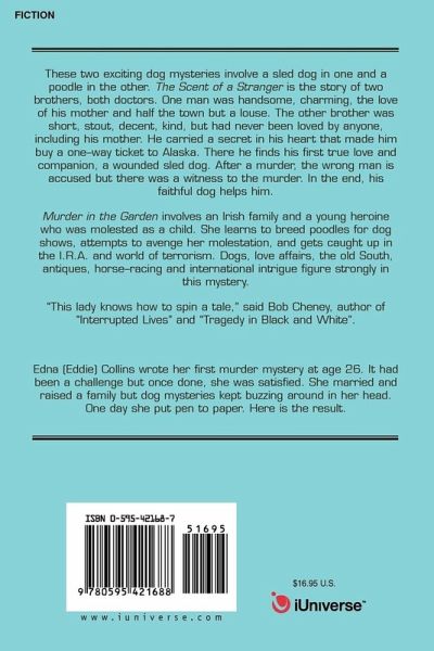 These two exciting dog mysteries involve a sled dog in one and a poodle in the other. The Scent of a Stranger is the story of two brothers, both doctors. One man was handsome, charming, the love of his mother and half the town but a louse. The other brother was short, stout, decent, kind, but had never been loved by anyone, including his mother. He carried a secret in his heart that made him buy a one-way ticket to Alaska. There he finds his first true love and companion, a wounded sled dog. After a murder, the wrong man is accused but there was a witness to the murder. In the end, his faithful dog helps him. Murder in the Garden involves an Irish family and a young heroine who was molested as a child. She learns to breed poodles for dog shows, attempts to avenge her molestation, and gets caught up in the I.R.A. and world of terrorism. Dogs, love affairs, the old South, antiques, horse-racing and international intrigue figure strongly in this mystery. "This lady knows how to spin a tale," said Bob Cheney, author of "Interrupted Lives" and "Tragedy in Black and White".
