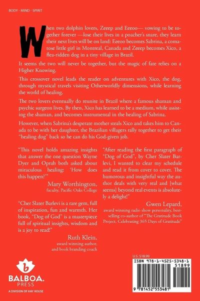 When two dolphin lovers, Zeeep and Eeeoo-vowing to be together forever -lose their lives in a poacher's snare, they learn their next lives will be on land: Eeeoo becomes Sabrina, a comatose little girl in Montreal, Canada and Zeeep becomes Xico, a flea-ridden dog in a tiny village in Brazil. It seems the two will never be together but the magic of fate relies on a higher knowing. This crossover novel leads the reader on adventures with Xico the dog through mystical travels visiting Otherworldly dimensions, learning the world of healing. The two lovers eventually reunite in Brazil where a famous shaman and psychic surgeon lives. When they meet again, Xico has learned to be a medium and is helping the shaman. He lovingly helps to initiate the healing of Sabrina. When Sabrina's desperate mother steals Xico and takes him to Canada to be with her daughter, the Brazilian villagers rally together to get their "healing dog" back so he can do his God-given job.