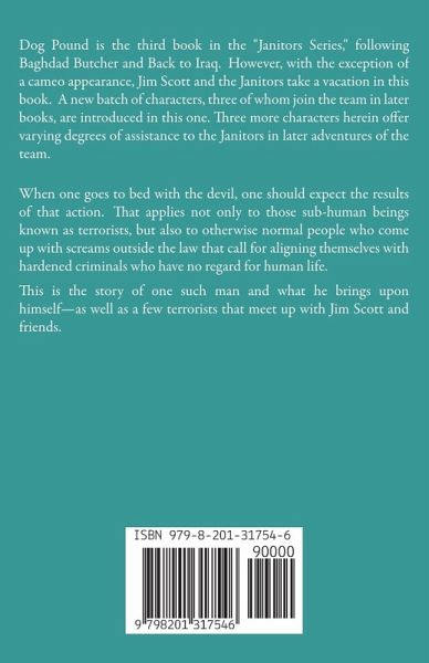 Dog Pound is the third book in the "Janitors Series," following Baghdad Butcher and Back to Iraq. However, with the exception of a cameo appearance, Jim Scott and the Janitors take a vacation in this book. A new batch of characters, three of whom join the team in later books, are introduced in this one. Three more characters herein offer varying degrees of assistance to the Janitors in later adventures of the team. When one goes to bed with the devil, one should expect the results of that action. That applies not only to those sub-human beings known as terrorists, but also to otherwise normal people who come up with screams outside the law that call for aligning themselves with hardened criminals who have no regard for human life. This is the story of one such man and what he brings upon himself-as well as a few terrorists that meet up with Jim Scott and friends.
