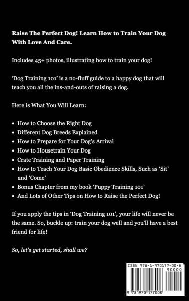 Learn How to Train Your Dog! Raise The Perfect Dog. Learn How to Train Your Dog With Love And Care. Includes 45+ photos, illustrating how to train your dog! Get Your Copy of 'Dog Training 101' Few things are as pure as the relationship between you and your dog. Nothing beats that friendly face when you get home from work! Or that unconditional love that only a dog can give... Dogs give so much joy! Which makes it our responsibility to: - Take care of them and - Treat them like familyBuy 'Dog Training 101' I'll be honest: raising the perfect pet has its challenges. Turning your new canine friend into an obedient, well-trained dog takes work. But that's why I wrote this dog training book! I have years of experience in training dogs. And now I'm sharing my expertise with you. I'm here to help. I'll teach you how to be your dog's best friend. Someone to look up to... 'Dog Training 101' is a no-fluff guide that will teach you all the ins-and-outs of raising a dog. From: - crate training to housetraining, and - basic commands to plain dog obedience training With this guide, your days of stress are over. Instead, you can start to fully enjoy every minute you spend with your dog! Why You Should Check Out 'Dog Training 101' This dog book is jam-packed with invaluable tips from a dog training expert. What's most important: I will take you by the hand and show you easy, practical step-by-step instructions to training the best dog ever. Your lucky dog. If I can do it, so can you! Here is What You Will Learn: - How to Choose the Right Dog - Different Dog Breeds Explained - How to Prepare for Your Dog's Arrival - How to Housetrain Your Dog - Crate Training and Paper Training - How to Teach Your Dog Basic Obedience Skills, Such as 'Sit' and 'Come' - And Lots of Other Tips and Advanced Techniques on How to Raise the Perfect Dog! Finally, as a FREE & EXCLUSIVE BONUS, you're also getting the chapter 'Getting Started With Puppy Training' from my popular book 'Puppy Training 101: The Essential Guide to Raising A Puppy With Love.' To recap: If you apply the tips in 'Dog Training 101', your life will never be the same. So, buckle up: train your dog well and you'll have a best friend for life! Let's get started, shall we? Take action now! Scroll to the top of this page and click the 'Buy Now' button.