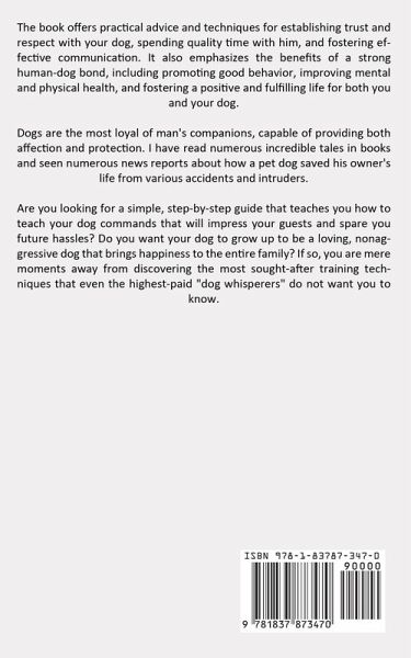 The book offers practical advice and techniques for establishing trust and respect with your dog, spending quality time with him, and fostering effective communication. It also emphasizes the benefits of a strong human-dog bond, including promoting good behavior, improving mental and physical health, and fostering a positive and fulfilling life for both you and your dog. Dogs are the most loyal of man's companions, capable of providing both affection and protection. I have read numerous incredible tales in books and seen numerous news reports about how a pet dog saved his owner's life from various accidents and intruders. Are you looking for a simple, step-by-step guide that teaches you how to teach your dog commands that will impress your guests and spare you future hassles? Do you want your dog to grow up to be a loving, nonaggressive dog that brings happiness to the entire family? If so, you are mere moments away from discovering the most sought-after training techniques that even the highest-paid "dog whisperers" do not want you to know.