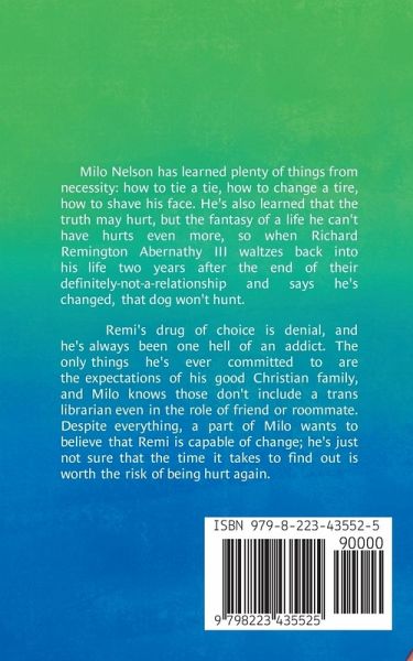 Milo Nelson has learned plenty of things from necessity: how to tie a tie, how to change a tire, how to shave his face. He's also learned that the truth may hurt, but the fantasy of a life he can't have hurts even more, so when Richard Remington Abernathy III waltzes back into his life two years after the end of their definitely-not-a-relationship and says he's changed, that dog won't hunt. Remi's drug of choice is denial, and he's always been one hell of an addict. The only things he's ever committed to are the expectations of his good Christian family, and Milo knows those don't include a trans librarian even in the role of friend or roommate. Despite everything, a part of Milo wants to believe that Remi is capable of change; he's just not sure that the time it takes to find out is worth the risk of being hurt again. Dog Won't Hunt is a high-heat (trans M/cis M) contemporary novel about identity, relationships, second chances, and being gay in the south.