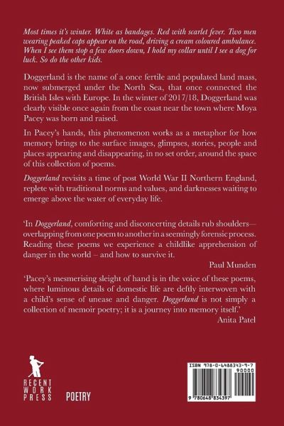 Doggerland is the name of a once fertile and populated land mass, now submerged under the North Sea, that once connected the British Isles with Europe. In the winter of 2017/18, Doggerland was clearly visible once again from the coast near the town where Moya Pacey was born and raised. In Pacey's hands, this phenomenon works as a metaphor for how memory works in bringing to the surface images, glimpses, stories, people and places appearing and disappearing, in no set order, around the space of this collection of poems. Doggerland revisits a time of post World War II northern England, replete with traditional norms and values, and darknesses waiting to emerge above the water of everyday life.