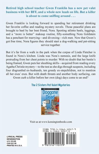 Retired high school teacher Gwen Franklin has a new pet valet business with her BFF, and a whole new leash on life. But a killer is about to come sniffing around . . . Gwen Franklin is looking forward to spending her retirement drinking her favorite coffee and reading mystery novels. Those peaceful plans are brought to heel by her best friend, Nora. Sporting stiletto heels, leggings, and a "more is better" makeup routine, fifty-something Nora Goldstein has a penchant for marrying—and divorcing—rich men. Now that Gwen’s got free time, Nora figures they should start a dog-walking and pet-sitting service together. But it’s far from a walk in the park when the corpse of Linda Fletcher is found in Nora’s kitchen. Linda was Nora’s nemesis, and the large knife protruding from her chest points to murder. With no doubt that her bestie’s being framed, Gwen puts her sleuthing skills—acquired from reading every Agatha Christie mystery—to the test as she digs through suspects, including four disgruntled ex-husbands, ten greedy ex-stepchildren, not to mention all her exes’ exes. But with death threats and another body surfacing, can Gwen curb a killer before her own (dog) days come to an end?