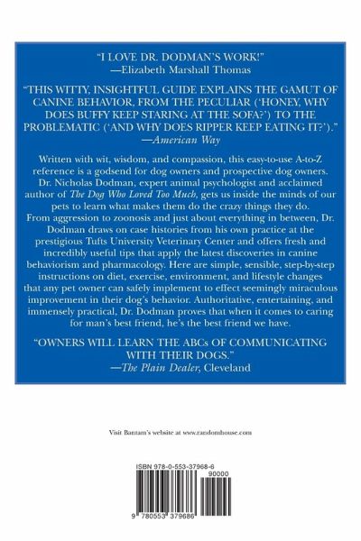 Written with wit, wisdom, and compassion, this easy--to--use A--to--Z reference is a godsend for dog owners and prospective dog owners. Dr. Nicholas Dodman, expert animal psychologist and acclaimed author of The Dog Who Loved Too Much, gets us inside the minds of our pets to learn what makes them do the crazy things they do. From aggression to zoonosis and just about everything in between, Dr. Dodman draws on case histories from his own practice at the prestigious Tufts University Veterinary Center and offers fresh and incredibly useful tips that apply the latest discoveries in canine behaviorism and pharmacology. Here are simple, sensible, step-by-step instructions on diet, exercise, environment, and lifestyle changes that any pet owner can safely implement to effect seemingly miraculous improvement in their dog's behavior. Authoritative, entertaining, and immensely practical, Dr. Dodman proves that when it comes to caring for man's best friend, he's the best friend we have.