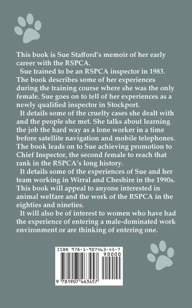 This book is Sue Stafford’s memoir of her early career with the RSPCA. Sue trained to be an RSPCA inspector in 1983. The book describes some of her experiences during the training course where she was the only female. Sue goes on to tell of her experiences as a newly qualified inspector in Stockport. It details some of the cruelty cases she dealt with and the people she met. She talks about learning the job the hard way as a lone worker in a time before satellite navigation and mobile telephones. The book leads on to Sue achieving promotion to Chief Inspector, the second female to reach that rank in the RSPCA’s long history. It details some of the experiences of Sue and her team working in Wirral and Cheshire in the 1990s. This book will appeal to anyone interested in animal welfare and the work of the RSPCA in the eighties and nineties. It will also be of interest to women who have had the experience of entering a male-dominated work environment or are thinking of entering one.