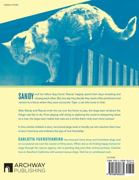 Sandy and her fellow dog friend, Rascal, happily spend their days wrestling and chasing each other. But one day they decide they need a little excitement and venture to a fence where they soon encounter Tiger, a cat who loves to chat. After Sandy and Rascal invite the cat over the fence to play, the dogs learn all about the things cats like to do. From playing with string to exploring the world to sharpening claws on a tree, the dogs soon realize that cats are a lot like them--only even more curious! In this colorful children's story, two bored dogs meet a friendly cat who teaches them how to live in harmony and embrace the joys of true friendship.
