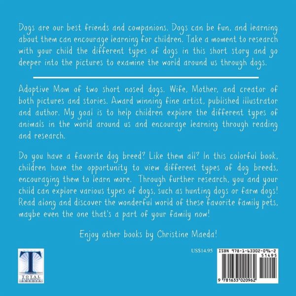 Dogs are our best friends and companions. Dogs can be fun, and learning about them can encourage learning for children. Take a moment to research with your child the different types of dogs in this short story and go deeper into the pictures to examine the world around us through dogs. Adoptive Mom of two short nosed dogs. Wife, Mother, and creator of both pictures and stories. Award winning fine artist, published illustrator and author. My goal is to help children explore the different types of animals in the world around us and encourage learning through reading and research. Do you have a favorite dog breed? Like them all? In this colorful book, children have the opportunity to view different types of dog breeds, encouraging them to learn more. Through further research, you and your child can explore various types of dogs, such as hunting dogs or farm dogs! Read along and discover the wonderful world of these favorite family pets maybe even the one that’s a part of your family now! Enjoy other books by Christine Maeda!
