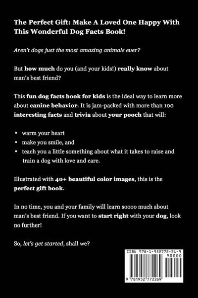 Get Amazed By These Facts About Man's Best Friend! Make A Loved One Happy With This Wonderful Dog Facts Book! Aren't dogs just the most amazing animals ever? Those big eyes, the foolish things they do: when you spend a minute with a dog, stress simply melts away like snow in the sun! But how much do you (and your kids!) really know about man's best friend? Get Your Copy Of: '101 Amazing Dog Fun Facts And Trivia For Kids' This fun dog facts book for kids is the ideal way to learn more about canine behavior. It is jam-packed with more than 100 interesting fun facts and trivia about your pooch that will: - warm your heart - make you smile, and - teach you a little something about what it takes to raise and train a dog with love and care. Illustrated with 40+ beautiful images, this is the perfect gift book!. In no time, you and your family will learn soooo much about man's best friend. If you want to start right with your dog, look no further! Why You Should Check Out '101 Amazing Dog Fun Facts And Trivia For Kids' This book is filled with fun facts shared by a dog training expert. Here is a Sneak Preview of What You Will Learn: - A dog can hear four times as far as humans can. - There are around 400 million dogs in the world. With 78 million, the U.S. has the highest pet dog population of all. - A dog that wags its tail with a big helicopter-like rotation is very friendly.And Do You Know The Answer To These Questions? - What is the net value of the richest dog in the world? - Which Beatles song contains a high-pitched whistle only dogs can hear? - Which dogs do not have pink tongues? - Where did the name Greyhound Bus come from? Buy '101 Amazing Dog Fun Facts And Trivia For Kids' to find out... Finally, as a FREE & EXCLUSIVE BONUS, you're also getting the chapter 'How to Choose the Right Dog' from my popular book 'Dog Training 101: The Essential Guide to Raising A Happy Dog With Love.' To recap: get to know the wonderful world of dogs and you may find yourself a new best friend for life! Let's get started, shall we? Take action now! Scroll to the top of this page and click the 'Buy Now' button.