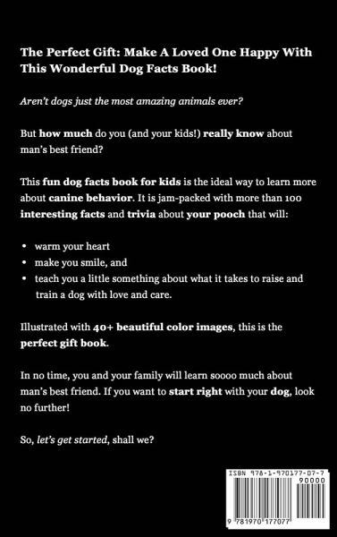Get Amazed By These Facts About Man's Best Friend! Make A Loved One Happy With This Wonderful Dog Facts Book! Aren't dogs just the most amazing animals ever? Those big eyes, the foolish things they do: when you spend a minute with a dog, stress simply melts away like snow in the sun! But how much do you (and your kids!) really know about man's best friend? Get Your Copy Of: '101 Amazing Dog Fun Facts And Trivia For Kids' This fun dog facts book for kids is the ideal way to learn more about canine behavior. It is jam-packed with more than 100 interesting fun facts and trivia about your pooch that will: - warm your heart - make you smile, and - teach you a little something about what it takes to raise and train a dog with love and care. Illustrated with 40+ beautiful images, this is the perfect gift book!. In no time, you and your family will learn soooo much about man's best friend. If you want to start right with your dog, look no further! Why You Should Check Out '101 Amazing Dog Fun Facts And Trivia For Kids' This book is filled with fun facts shared by a dog training expert. Here is a Sneak Preview of What You Will Learn: - A dog can hear four times as far as humans can. - There are around 400 million dogs in the world. With 78 million, the U.S. has the highest pet dog population of all. - A dog that wags its tail with a big helicopter-like rotation is very friendly.And Do You Know The Answer To These Questions? - What is the net value of the richest dog in the world? - Which Beatles song contains a high-pitched whistle only dogs can hear? - Which dogs do not have pink tongues? - Where did the name Greyhound Bus come from? Buy '101 Amazing Dog Fun Facts And Trivia For Kids' to find out... Finally, as a FREE & EXCLUSIVE BONUS, you're also getting the chapter 'How to Choose the Right Dog' from my popular book 'Dog Training 101: The Essential Guide to Raising A Happy Dog With Love.' To recap: get to know the wonderful world of dogs and you may find yourself a new best friend for life! Let's get started, shall we? Take action now! Scroll to the top of this page and click the 'Buy Now' button.
