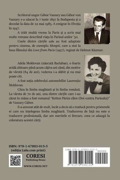 Scriitorul ungur Gábor Vaszary sau Gábor von Vaszary s-a n¿scut la 7 iunie 1897 la Budapesta ¿i a decedat la data de 22 mai 1985. A emigrat în Elve¿ia în 1947. A tr¿it mult¿ vreme la Paris ¿i a scris mai multe romane, descriind viäa în Parisul anilor '50. Unele dintre c¿r¿ile sale au fost adaptate pentru cinema, de exemplu ¿Monpti", care a stat la baza filmului ¿With Love from Paris" (1957), regizat de Helmut Käutner. Adela Moldovan (n¿scut¿ Barlabas), care a realizat traducerea acestei c¿r¿i, a fost o foarte avid¿ cititoare pân¿ acum câ¿iva ani când, din motive de vârst¿, vederea i-a sl¿bit ¿i nu mai poate citi. Citea în limba maghiar¿ ¿i în limba român¿. La vârsta de 70 de ani, una dintre c¿r¿ile care i-au c¿zut în mâna a fost romanul "Ketten Párizs ellen (Doi contra Parisului)" de Vaszary Gábor. S-a amuzat atât de mult, încât a decis s¿ o traduc¿ pentru prietenele ei care nu în¿elegeau limba maghiar¿. Acum cartea îi va amuza pe töi cei care o pot citi în limba român¿.