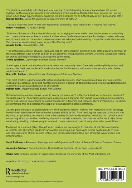 "Doing Academic Careers Differently challenges linear accounts of the academic career and it rebukes the hegemonic moves that push academics into impossible, unsustainable, unhealthy conduct, values, and practices. By collaborating, theorizing, and writing differently 79 academics from 21 countries tell stories with images, poetry, prose, interviews, and essays on contemporary academic lives. The stories thrive on complexity, difference, dialogue, creativity, divergence, and ambiguity. Robinson, Bristow, and Ratle beautifully curate the emerging richness in this book that becomes an enthralling and contemplative new archive of academics' lives where finally alternative voices, knowledges, and experiences can be heard over the conformism and pain of career as individual/ individualizing competition and instrumentality. The book offers a refreshing, powerful, and life-affirming read." Alessia Contu, UMass Boston, USA