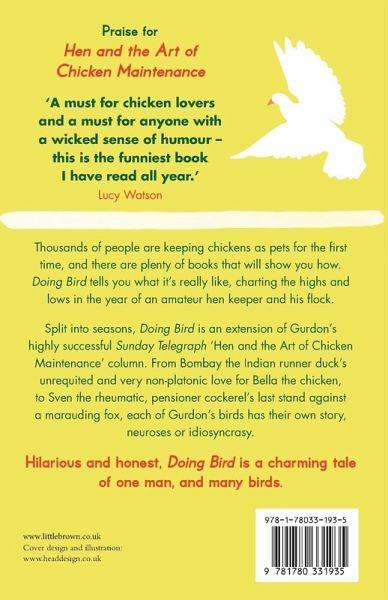 Thousands of people are keeping chickens as pets for the first time. There are plenty of books that will show you how. Doing Bird tells you what it's like, charting the highs and lows in the year of an amateur hen keeper and his flock. Split into months and seasons, Doing Bird is an extension of Gurdon's highly successful Sunday Telegraph 'Hen and the Art of Chicken Maintenance' column, and brings out the characters and idiosyncrasies of the birds themselves. Highlights include Bombay the Indian runner duck's unrequited and very non-platonic love for Bella the chicken. Sven the rheumatic, pensioner cockerel's last stand against a marauding fox, and his son Svenson's sometimes awkward transition from teenaged pretender to putative Alpha male with a dodgy aim. We see the power play between flock old stagers Peeping Chicken, Anne Summers, Brahms, Meringue, Bella and Nude to new arrivals Squawks 1 and 2 and the pair of birds initially known as 'the other two,' until one of them tries savaging the author's hand and is re-christened Slasher -leaving her colleague with the sobriquet of 'Too'.