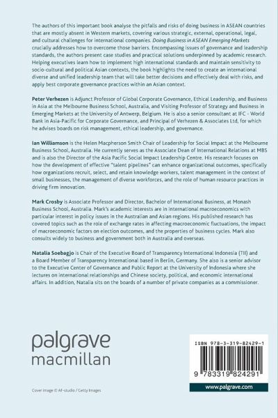 Peter Verhezen is Adjunct Professor of Global Corporate Governance, Ethical Leadership and Business in Asia at the Melbourne Business School, Australia, and a Visiting Professor of Strategy and Business in Emerging Markets at the University of Antwerp, Belgium. He is also a senior consultant at IFC - World Bank in Asia-Pacific for Corporate Governance, and Principal of Verhezen & Associates Ltd, for which he advises boards on risk management, ethical leadership and governance. Mark Crosby is Associate Professor of Economics at Melbourne Business School, Australia. Mark's academic interests are in international macroeconomics with particular interest in policy issues in the Australian and Asian regions. His published research has covered topics such as the role of exchange rates in affecting macroeconomic fluctuations, the impact of macroeconomic factors on election outcomes, and the properties of business cycles. Mark also consults widely to business and government bothin Australia and overseas. Natalia Soebagjo is Chair of the Executive Board of Transparency International Indonesia (TII) and a Board Member of Transparency International based in Berlin, Germany. She also is a senior advisor to the Executive Center of Governance and Public Report at the University of Indonesia where she lectures on international relationships and Chinese society, political and economic international affairs. In addition, Natalia sits on the boards of a number of private companies as a commissioner. Ian Williamson is the Helen Macpherson Smith Chair of Leadership for Social Impact at the Melbourne Business School, Australia. He currently serves as the Associate Dean of International Relations at MBS and is also the Director of the Asia Pacific Social Impact Leadership Centre. His research focuses on how the development of effective "talent pipelines" can enhance organizational outcomes, specifically how organizations recruit, select, and retain knowledge workers, talent management in the context of small businesses, the management of diverse workforces and the role of human resource practices in driving firm innovation.