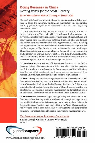 Although this book has a specific focus on Australian firms doing business in China, the important and unique contribution this book makes will help you and anyone in an organization that is considering doing business in China. China maintains a high growth economy and is currently the second largest in the world. This book, which includes results from research interviews conducted with business executives from 40 organizations, will assist in preparing to do business in China. This book takes you through the various elements associated with doing business in China, including the opportunities that are available and the obstacles that organizations can face, supported by data from real businesses internationalizing to China. It examines key areas including the foreign direct investment and trade framework, Chinese culture, political and legal frameworks, intellectual property regulations, motivations for internationalization, market entry strategy, and human resource management issues.