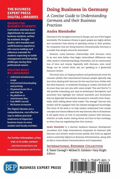 The focus of the book is to help readers understand how certain concepts and values influence the way Germans like to do business. Germany is the strongest economy in Europe, and one of the largest worldwide. The business climate is good, people are highly skilled, and consumers have plenty of spending money in their pockets; for companies that are doing business internationally, Germany is a market that simply cannot be overlooked. However, many business relationships with Germans come to an end even before they begin; intercultural differences very often result in misunderstandings, frustration, and an unnecessary loss of time and money. Especially with Germans, even small things can be crucial when you are speaking to a (potential) business contact. This book aims at helping students and professionals avoid the common pitfalls that international business people typically step into when dealing with Germans for the very first time. Unlike with the other business- or text-books focusing on culture, this book will do more than just arm you with some simple "Dos and Don'ts;" it will provide interesting and easy-to- understand descriptions and anecdotes that highlight the cultural standards and dimensions that are (typically) theoretically discussed in scientific texts. Essentially, while talking about what makes "the average" German tick, readers will be equipped with the relevant background knowledge. The focus of the book is to help readers understand how certain concepts and values influence the way Germans like to do business. It will guide them on how to successfully interact with Germans, whether at trade shows, during virtual and face-to-face meetings, or when they are negotiating their first contract.