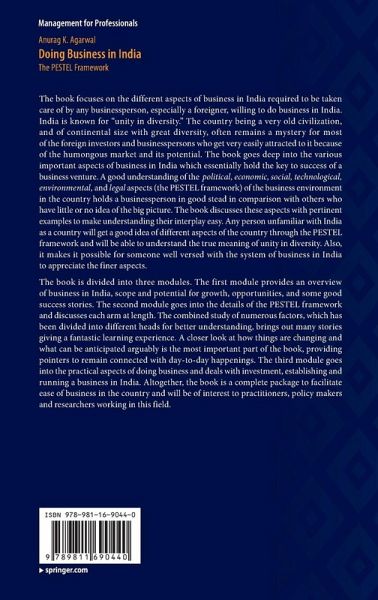 The book focuses on the different aspects of business in India required to be taken care of by any businessperson, especially a foreigner, willing to do business in India. India is known for "unity in diversity." The country being a very old civilization, and of continental size with great diversity, often remains a mystery for most of the foreign investors and businesspersons who get very easily attracted to it because of the humongous market and its potential. The book goes deep into the various important aspects of business in India which essentially hold the key to success of a business venture. A good understanding of the political, economic, social, technological, environmental, and legal aspects (the PESTEL framework) of the business environment in the country holds a businessperson in good stead in comparison with others who have little or no idea of the big picture. The book discusses these aspects with pertinent examples to make understanding their interplay easy. Any person unfamiliar with India as a country will get a good idea of different aspects of the country through the PESTEL framework and will be able to understand the true meaning of unity in diversity. Also, it makes it possible for someone well versed with the system of business in India to appreciate the finer aspects.