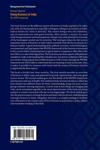 The book focuses on the different aspects of business in India required to be taken care of by any businessperson, especially a foreigner, willing to do business in India. India is known for "unity in diversity." The country being a very old civilization, and of continental size with great diversity, often remains a mystery for most of the foreign investors and businesspersons who get very easily attracted to it because of the humongous market and its potential. The book goes deep into the various important aspects of business in India which essentially hold the key to success of a business venture. A good understanding of the political, economic, social, technological, environmental, and legal aspects (the PESTEL framework) of the business environment in the country holds a businessperson in good stead in comparison with others who have little or no idea of the big picture. The book discusses these aspects with pertinent examples to make understanding their interplay easy. Any person unfamiliar with India as a country will get a good idea of different aspects of the country through the PESTEL framework and will be able to understand the true meaning of unity in diversity. Also, it makes it possible for someone well versed with the system of business in India to appreciate the finer aspects.
