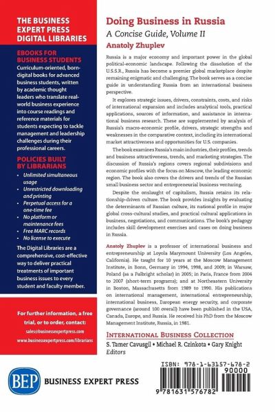 Russia is a major economy and important power in the global political-economic landscape. Following the dissolution of the USSR, Russia has become a premier global marketplace despite remaining enigmatic and challenging. The book serves as a concise guide in understanding Russia from an international business perspective. It explores strategic issues, drivers, constraints, costs, and risks of international expansion and includes analytical tools, practical applications, sources of information, and assistance in international business research. These are supplemented by analysis of Russia's macro-economic profile, drivers, strategic strengths and weaknesses in the comparative context, including its international market attractiveness and opportunities for U.S. companies. The book examines Russia's main industries, their profiles, trends and business attractiveness, trends, and marketing strategies. The discussion of Russia's regions covers regional subdivisions and economic profiles with the focus on Moscow, the leading economic region. The book also covers the drivers and trends of the Russian small business sector and entrepreneurial business venturing. Despite the onslaught of capitalism, Russia retains its relationship-driven culture. The book provides insights by evaluating the determinants of Russian culture, its national profile in major global cross-cultural studies, and practical cultural applications in business, negotiations, and communications. The book's pedagogy includes skill development exercises and cases on doing business in Russia.