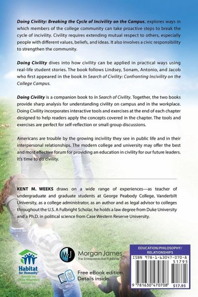 Doing Civility: Breaking the Cycle of Incivility on the Campus, by Kent M. Weeks, encourages students, faculty, and staff to take proactive steps to become more civil. Civility involves extending mutual respect to others, especially people with different values, beliefs, and ideas. It also involves a civic responsibility to strengthen the community. Weeks notes that changing structures or policies can be an important first step, but only individuals, sometimes acting in a collective capacity, can mediate the conflicting passions of the moment. Doing Civility uses real-life stories involving students and faculty to illustrate how to overcome the complex societal norms that trigger incivility on campus. Each chapter also includes interactive tools and exercises to help readers personally engage the subject of civility.
