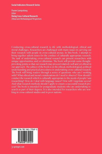 Conducting cross-cultural research is rife with methodological, ethical and moral challenges. Researchers are challenged with many issues in carrying out their research with people in cross-cultural arenas. In this book, I attempt to bring together salient issues for the conduct of culturally appropriate research. The task of undertaking cross-cultural research can present researchers with unique opportunities, and yet dilemmas. The book will provide some thought-provoking points so that our research may proceed relatively well and yet ethical in our approach. The subject of the book is on the ethical, methodological, political understanding and practical procedures in undertaking cross-cultural research. The book will bring readers through a series of questions: who am I working with? What ethical and moral considerations do I need to observe? How should I conduct the research which is culturally appropriate to the needs of people I am researching? How do I deal with language issues? How will I negotiate access? And what research methods should I apply to ensure a successful research process? The book is intended for postgraduate students who are undertaking research as part of their degrees. It is also intended for researchers who are working in cross-cultural studies and in poor nations.