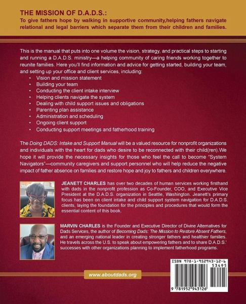 This is the manual that puts into one volume the vision, strategy, and practical steps to starting and running a D.A.D.S. ministry-a helping community of caring friends working together to reunite families. Here you'll find information and advice for getting started, building your team, and setting up your office and client services, including: · Vision and mission statement · Building your team · Conducting the client intake interview · Helping clients navigate the system · Dealing with child support issues and obligations · Parenting plan assistance · Administration and scheduling · Ongoing client support · Conducting support meetings and fatherhood training The aim of the Doing DADS: Intake and Support Manual is to become a valued resource for nonprofit organizations and individuals with the heart for dads who desire to be reconnected with their child(ren). We hope it will provide the necessary insights for those who feel the call to become "System Navigators"-community caregivers and support personnel who will help reduce the negative impact of father absence on families and restore hope and joy to fathers and children everywhere.