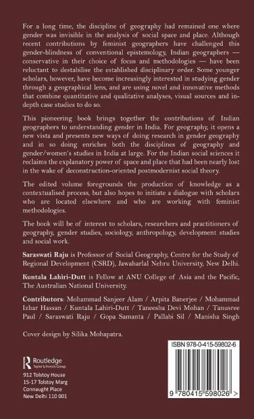 Until the 1970s gender had been invisible in analyses of social space and place in the androcentric discipline of geography. While recent contributions to feminist geography have challenged this, in India the engagement of geographers with gender, by being conservative in its choice of focus and orthodox in methodology, has been unable to destabilise the established disciplinary order. However, with younger scholars becoming increasingly interested in studying gender in geography, novel and innovative methods that include combinations of quantitative and qualitative analyses, visual sources and in-depth case studies are being tried out and accepted in geography despite its masculine legacy. This pioneering study brings together Indian geographers contributions to understanding gender, and through them, seeks to enrich the discipline of geography. It engages with the recent spatial turn in the social sciences, which has reclaimed the explanatory power of space and place in social theory that had been nearly lost to deconstructive postmodernist scholarship. The volume draws entirely from the Indian scholarship, showcasing contextualised knowledge production, but hopes to initiate a a dialogue with scholars elsewhere working with feminist methodologies.