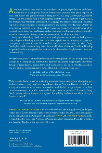 How reproductive justice birth workers and queer parents build kinships and care relations that resist oppressive structures. Anti-trans policies that restrict the boundaries of gender, reproduction, and family formation are a dangerous form of reproductive injustice with grave impacts on trans, nonbinary, and gender nonconforming people. In Doing Gender Justice, Shui-yin Sharon Yam and Natalie Fixmer-Oraiz explore the intricate intersections of gender, race, and reproductive politics to illuminate how language and care practices can be reshaped to promote transformations at the structural level and in small everyday ways. Only by enacting justice-oriented forms of reproductive care and relations, Yam and Fixmer-Oraiz contend, could activists and health care workers challenge the dominant affective and ideological investments in binary gender and its complicity in white supremacy. Set against a backdrop of relentless anti-trans legislation and attacks on bodily autonomy, this groundbreaking work shares the lived experiences and advocacy of queer and trans parents, gender-inclusive birth workers, and reproductive justice activists. Through rich storytelling and rigorous analysis of ethnographic data and cultural artifacts, the authors highlight innovative tactics that trans and nonbinary people use to dismantle oppressive systems and create a more expansive definition of family and kinship. Organized to examine how the dominant gender system influences discursive and cultural practices in multiple contexts, this book amplifies rhetorical inventions and tactics deployed by reproductive justice advocates, birth workers, and queer people who have created trans-inclusive spaces for reproduction and family-making. Doing Gender Justice offers a compelling vision for a world where all forms of family and kinship are possible and where reproductive justice can be advanced in a deeply intersectional and coalitional way.