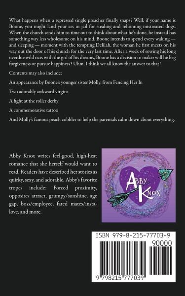 What happens when a repressed single preacher finally snaps? Well, if your name is Boone, you might land your ass in jail for stealing and rehoming mistreated dogs. When the church sends him to time out to think about what he's done, he instead has something way less wholesome on his mind. Boone intends to spend every waking — and sleeping — moment with the tempting Delilah, the woman he first meets on his way out the door of his church for the very last time. After a week of sowing his long overdue wild oats with the girl of his dreams, Boone has a decision to make: will he beg forgiveness or pursue happiness? Uhm, I think we all know the answer to that! Contents may also include: An appearance by Boone's younger sister Molly, from Fencing Her In Two adorably awkward virgins A fight at the roller derby A commemorative tattoo And Molly's famous peach cobbler to help the parentals calm down about everything.