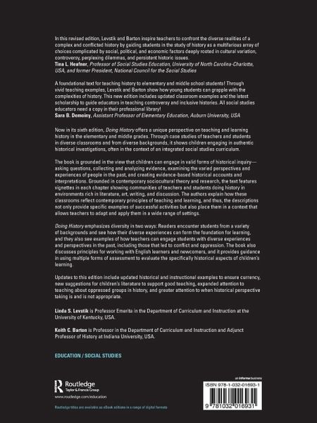 As a path-breaking, field-defining text, Doing History is a timeless, essential and mindful resource for social studies educators. In this revised edition, Levstik and Barton inspire teachers to confront the diverse realities of a complex and conflicted history by guiding students in the study of history as a multifarious array of choices complicated by social, political, and economic factors deeply rooted in cultural variation, controversy, perplexing dilemmas, and persistent historic issues. Grounded in authentic and research-informed classroom applications, each chapter presents tools to constructively empower students as transformative, agentic beings capable of engaging in historical inquiry which teaches them how to seek justice, learn from diverse people, exercise reasoned deliberation, intelligently participate in community-facing civil action, and live harmoniously in a complex, diverse world.