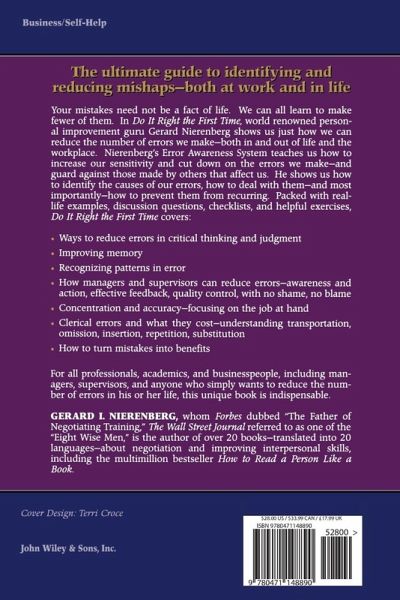 The ultimate guide to identifying and reducing mishaps--both at work and in life Your mistakes need not be a fact of life. We can all learn to make fewer of them. In Do It Right the First Time, world renowned personal improvement guru Gerard Nierenberg shows us just how we can reduce the number of errors we make--both in and out of life and the workplace. Nierenberg's Error Awareness System teaches us how to increase our sensitivity and cut down on the errors we make--and guard against those made by others that affect us. He shows us how to identify the causes of our errors, how to deal with them--and most importantly--how to prevent them from recurring. Packed with real-life examples, discussion questions, checklists, and helpful exercises, Do It Right the First Time covers: * Ways to reduce errors in critical thinking and judgment * Improving memory * Recognizing patterns in error * How managers and supervisors can reduce errors--awareness and action, effective feedback, quality control, with no shame, no blame * Concentration and accuracy--focusing on the job at hand * Clerical errors and what they cost--understanding transportation, omission, insertion, repetition, substitution * How to turn mistakes into benefits For all professionals, academics, and businesspeople, including managers, supervisors, and anyone who simply wants to reduce the number of errors in his or her life, this unique book is indispensable.
