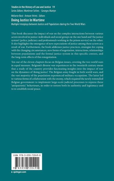 Ten out of the eleven chapters focus on Belgian issues, covering the two world wars in equal measure. Belgium's diverse war experiences in the twentieth century mean that a study of the country provides fascinating insights into the impact of war on the dynamics of 'doing justice'. The Belgian army fought in both world wars, and the vast majority of the population experienced military occupation. The latter led to various forms of collaboration with the enemy, which required the newly reinstalled Belgian government to implement large-scale judicial processes to repress these 'antipatriotic' behaviours, in order to restore both its authority and legitimacy and to re-establish social peace.