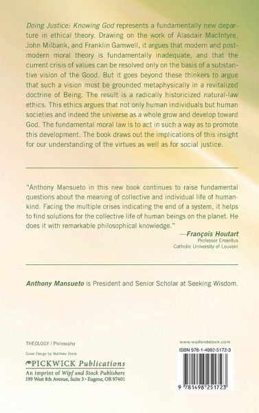Doing Justice: Knowing God represents a fundamentally new departure in ethical theory. Drawing on the work of Alasdair MacIntyre, John Milbank, and Franklin Gamwell, it argues that that modern and postmodern moral theory is fundamentally inadequate, and that the current crisis of values can be resolved only on the basis of a substantive vision of the Good. But it goes beyond these thinkers to argue that such a vision must be grounded metaphysically in a revitalized doctrine of Being. The result is a radically historicized natural-law ethics. This ethics argues that not only human individuals but human societies and indeed the universe as a whole grow and develop toward God. The fundamental moral law is to act in such a way as to promote this development. The book draws out the implications of this insight for our understanding of the virtues as well as for social justice.