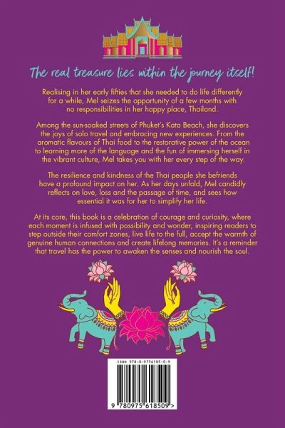 THE REAL TREASURE LIES WITHIN THE JOURNEY ITSELF Realising in her early fifties that she needed to do life differently for a while, Mel seizes the opportunity of a few months with no responsibilities in her happy place, Thailand. Among the sun-soaked streets of Phuket's Kata Beach, she discovers the joys of solo travel and embracing new experiences. From the aromatic flavours of Thai food to the restorative power of the ocean to learning more of the language and the fun of immersing herself in the vibrant culture, Mel takes you with her every step of the way. The resilience and kindness of the Thai people she befriends have a profound impact on her. As her days unfold, Mel candidly reflects on love, loss and the passage of time, and sees how essential it was for her to simplify her life. At its core, this book is a celebration of courage and curiosity, where each moment is infused with possibility and wonder, inspiring readers to step outside their comfort zones, live life to the full, accept the warmth of genuine human connections and create lifelong memories. It's a reminder that travel has the power to awaken the senses and nourish the soul. If you're considering your first solo adventure or simply enjoy reading about the wanderlust-filled tales of others and the serendipitous encounters along the way, this book will captivate you from start to finish. Leave behind the monotony of daily life and be prepare to be transported to a part of Thailand that will soon find a place on your travel bucket list.