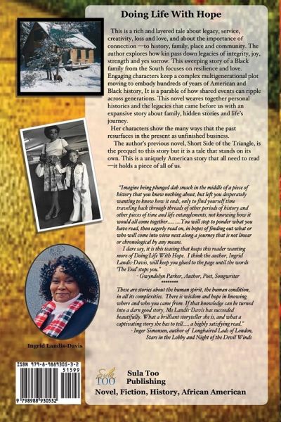 Imagine being plunged dab smack in the middle of a piece of history that you knew nothing about, but left you desperately wanting to know how it ends, only to find yourself time traveling back through threads of other periods of history and other pieces of time and life entanglements, not knowing how it would all come together. I read on and was transported to numerous time periods, involving people in heralding situations, with no understanding of how it would all fit together, yet intuitively knowing it does and wanting to know the how, the when, and the where, this patchwork quilt of history would all come together. The protagonist takes you back into her many past journeys to put context to the modern complexities of her life. You will not know where you are going, or who you will be introduced to or what situation you will find unfolding. You will stop to ponder what you have read, then eagerly read on, in hopes of finding out what or who will come into view next along a journey that is not linear or chronological by any means. I dare say, it is this teasing that keeps this reader wanting more of Doing Life With Hope. I think the author, Ingrid Landis-Davis, will keep you glued to the page until the words 'The End' stops you. Gwyndolyn Parker, Author, Poet, Songwriter Books: Systematic Denial of the American Dream My Shrink Asked Me What I was Thinking Coffee, Tea, and Conversation The Re-Knowing Revisited
