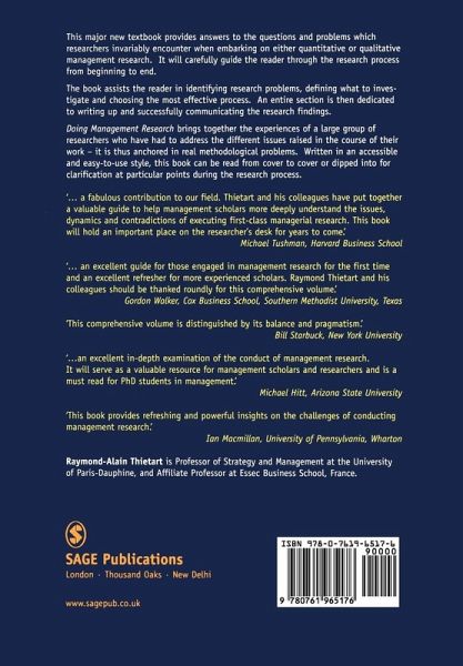 `This book provides refreshing and powerful insights on the challenges of conducting management research from a European perspective. Particulalrly for someone embarking on a managment research career this book will provide valuable guidelines.' -- Ian MacMillan, Wharton School of Business, University of Pennsylvania `This comprehensive volume is distinguished by its balance and pragmatism. The authors who present the various research methods are not proponents but researchers who have applied these methods. The authors who discuss philosophical and strategic issues are not advocates but researchers who have had to confront these issues in their research' - Bill Starbuck, New York University `Doing Management Research is a fabulous contribution to our field. Thietart and his colleagues have put together a unique and valuable guide to help management scholars more deeply understand the issues, dynamics and contradictions of executing first class managerial research. This book will hold an important place on the researcher's desk for years to come' - Michael Tushman, Harvard Business School 'This is an excellent in-depth examination of the conduct of management research. It will serve as a valuable resource for management scholars and researchers and is a must read for Ph.D. students in management.' -- Michael Hitt, Arizona State University `This book will prove to be an excellent guide for those engaged in management research for the first time and an excellent refresher for more experienced scholars. Raymond Thietart and his colleagues should be thanked roundly for this comprehensive volume' - Gordon Walker, Southern Methodist University, Cox Business School `This textbook makes an outstanding contribution to texts on management research. For researchers considering management research it offers an extensive guide to the research process' - Paula Roberts, Nurse Researcher Doing Management Research, a major new textbook, provides answers to questions and problems which researchers invariably encounter when embarking on management research, be it quantitative or qualitative. This book will carefully guide the reader through the research process from beginning to end. An excellent tool for academics and students, it enables the reader to acquire and build upon empirical evidence, and to decide what tools to use to understand and describe what is being observed, and then, which methods of analysis to adopt. There is an entire section dedicated to writing up and communicating the research findings. Written in an accessible and easy-to-use style, this book can be read from cover to cover or dipped into, to clarify particular issues during the research process. Doing Management Research results from the 'hands-on' experience of a large group of researchers who have all had to address the different issues raised when undertaking management research. It is anchored in real methodological problems that researchers face in their work. This work will also become one of the most useful reference tools for senior researchers who are looking for answers to epistemological or methodological problems.