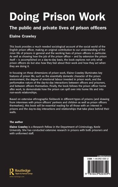 This book provides a much-needed sociological account of the social world of the English prison officer, making an original contribution to our understanding of the inner life of prisons in general and the working lives of prison officers in particular. As well as revealing how the job of the prison officer - and of the prison itself - is accomplished on a day-to-day basis, the book explores not only what prison officers do but also how they feel about their work. In focusing on how prison officers feel about their work this book makes a number of interesting revelations - about the essentially domestic nature of much of the work they do, about the degree of emotional labour invested in it and about the performance nature of many of the day-to-day interactions between officers and prisoners. Finally, the book follows the prison officer home after work, showing how the prison can spill over into their home lives and family relationships. Based on extensive ethnographic fieldwork in different types of prisons (including interviews with prison officers' wives and children as well as prison officers themselves), this book will be essential reading for all those with an interest in how prisons and organisations more generally operate in practice.