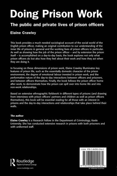 This book provides a much-needed sociological account of the social world of the English prison officer, making an original contribution to our understanding of the inner life of prisons in general and the working lives of prison officers in particular. As well as revealing how the job of the prison officer - and of the prison itself - is accomplished on a day-to-day basis, the book explores not only what prison officers do but also how they feel about their work. In focusing on how prison officers feel about their work this book makes a number of interesting revelations - about the essentially domestic nature of much of the work they do, about the degree of emotional labour invested in it and about the performance nature of many of the day-to-day interactions between officers and prisoners. Finally, the book follows the prison officer home after work, showing how the prison can spill over into their home lives and family relationships. Based on extensive ethnographic fieldwork in different types of prisons (including interviews with prison officers' wives and children as well as prison officers themselves), this book will be essential reading for all those with an interest in how prisons and organisations more generally operate in practice.