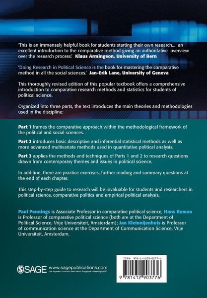 This is an immensely helpful book for students starting their own research... an excellent introduction to the comparative method giving an authoritative overview over the research process - Klaus Armingeon, University of Bern Doing Research in Political Science is the book for mastering the comparative method in all the social sciences - Jan-Erik Lane, University of Geneva This book has established itself as a concise and well-readable text on comparative methods and statistics in political science I...strongly recommend it. - Dirk Berg-Schlosser, Philipps-University Marburg This thoroughly revised edition of the popular textbook offers an accessible but comprehensive introduction to comparative research methods and statistics for students of political science. Clearly organized around three parts, the text introduces the main theories and methodologies used in the discipline. Part 1 frames the comparative approach within the methodological framework of the political and social sciences. Part 2 introduces basic descriptive and inferential statistical methods as well as more advanced multivariate methods used in quantitative political analysis. Part 3 applies the methods and techniques of Parts 1 & 2 to research questions drawn from contemporary themes and issues in political science. Incorporating practice exercises, ideas for further reading and summary questions throughout, Doing Research in Political Science provides an invaluable step-by-step guide for students and researchers in political science, comparative politics and empirical political analysis.